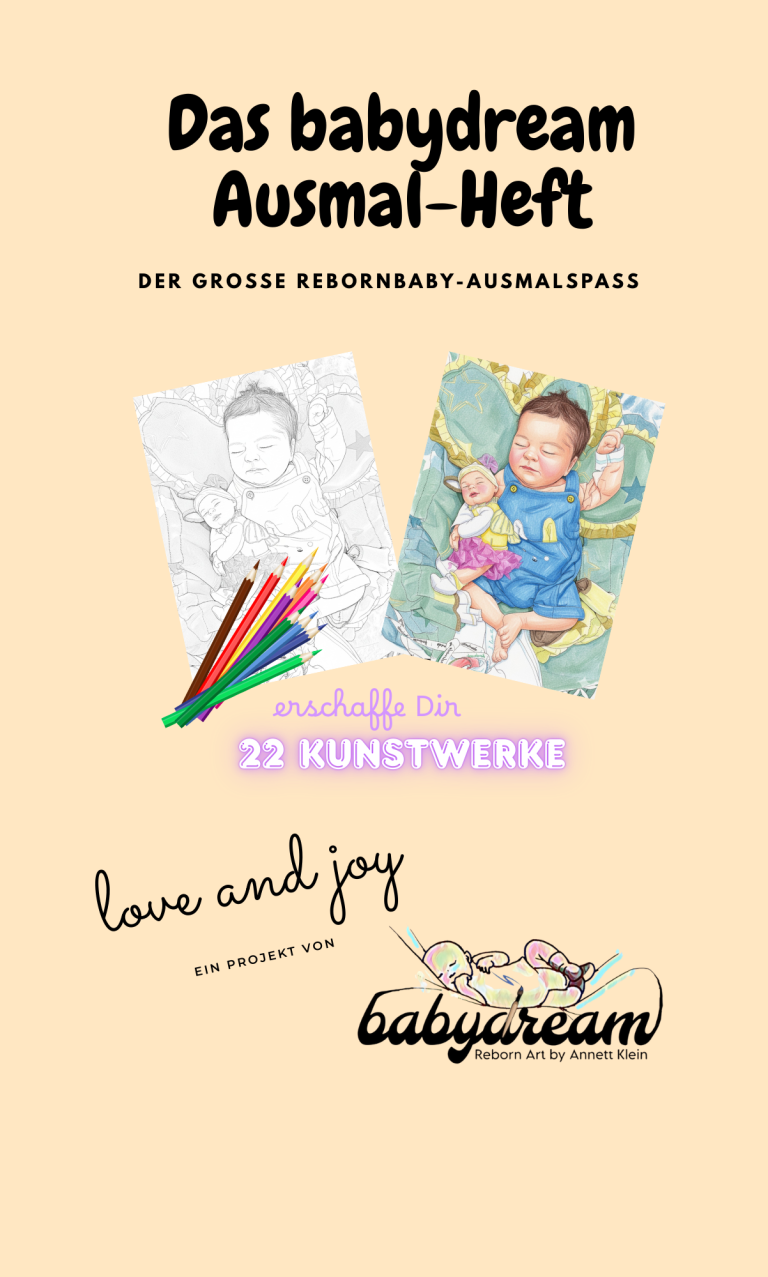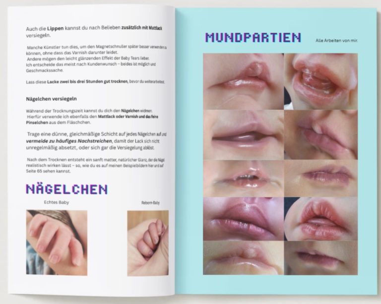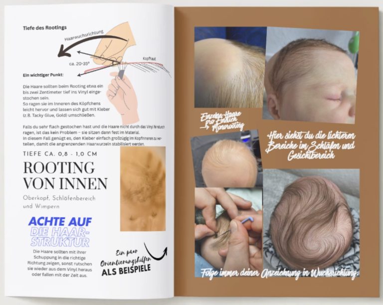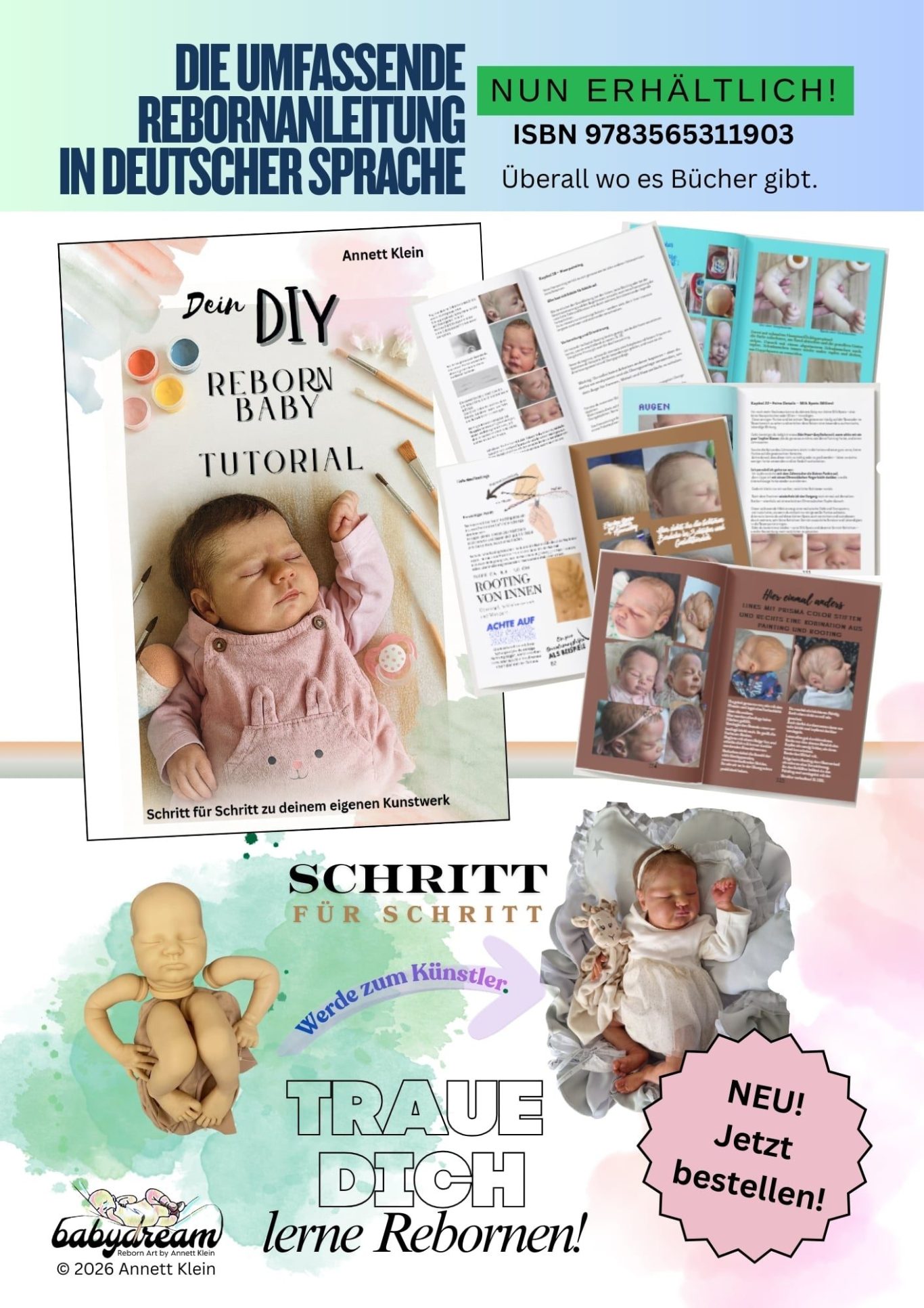 Da ich mein Wissen gerne teile und nichts von Geheimniskrämerei halte, ist schließlich mein Buch „Dein DIY Reborn Tutorial“ entstanden. Es führt Schritt für Schritt durch den gesamten Entstehungsprozess eines Reborn-Babys – von der Auswahl des Bausatzes über Materialien, Färbetechniken, Rooting oder Hairpainting bis hin zu Füllung, Präsentation, Verkauf und rechtlichen Grundlagen.