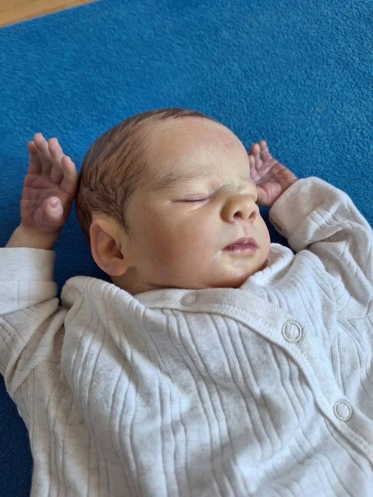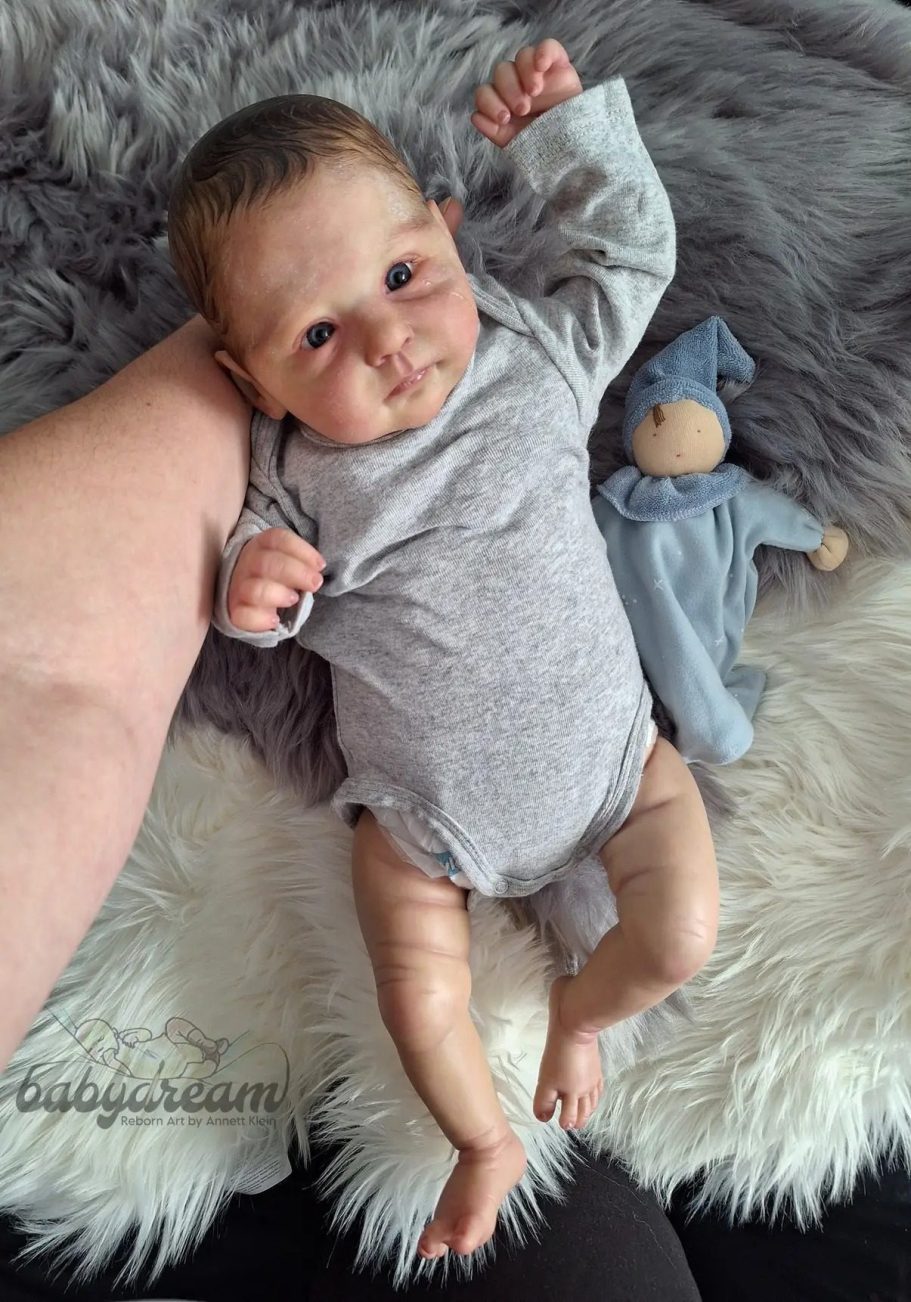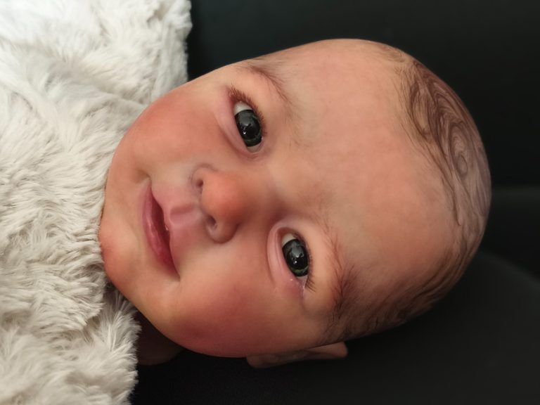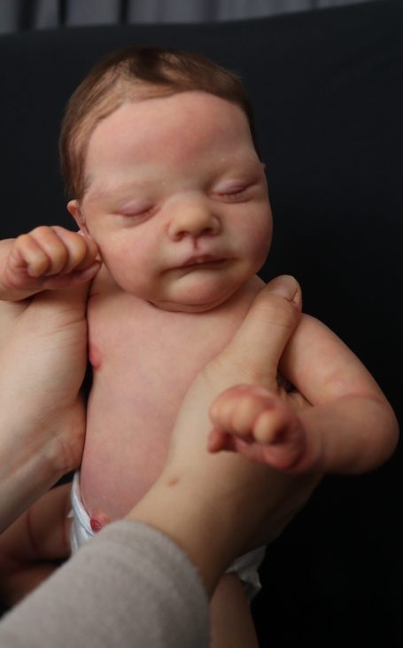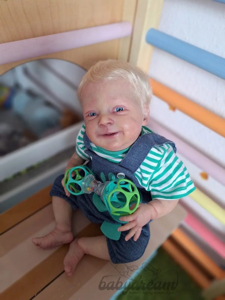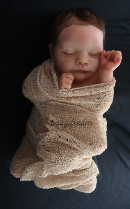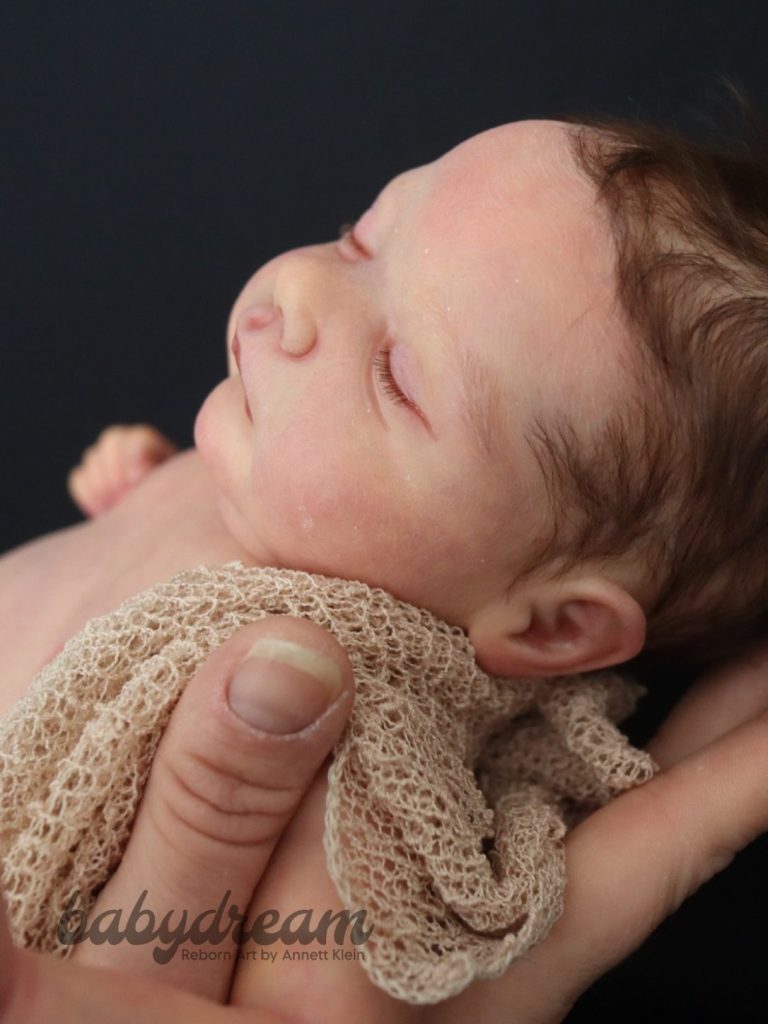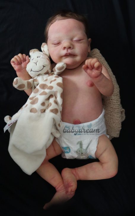 Die Haare sind in feinstem Mono-und Microrooting einzeln gestochen und aus feinem Mohair von JuNa. Die Bauchplatte für tolle Fotoshootings vollendet das Meisterwerk. Er wird mich nach Sonneberg begleiten.