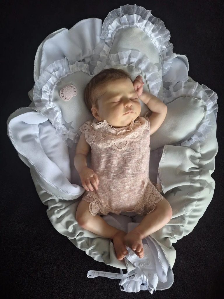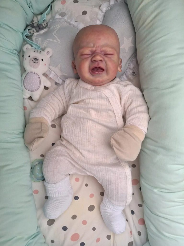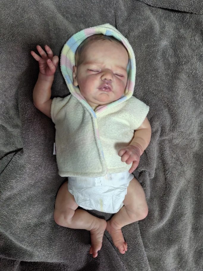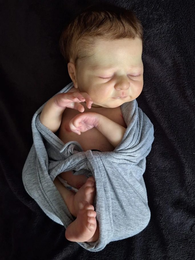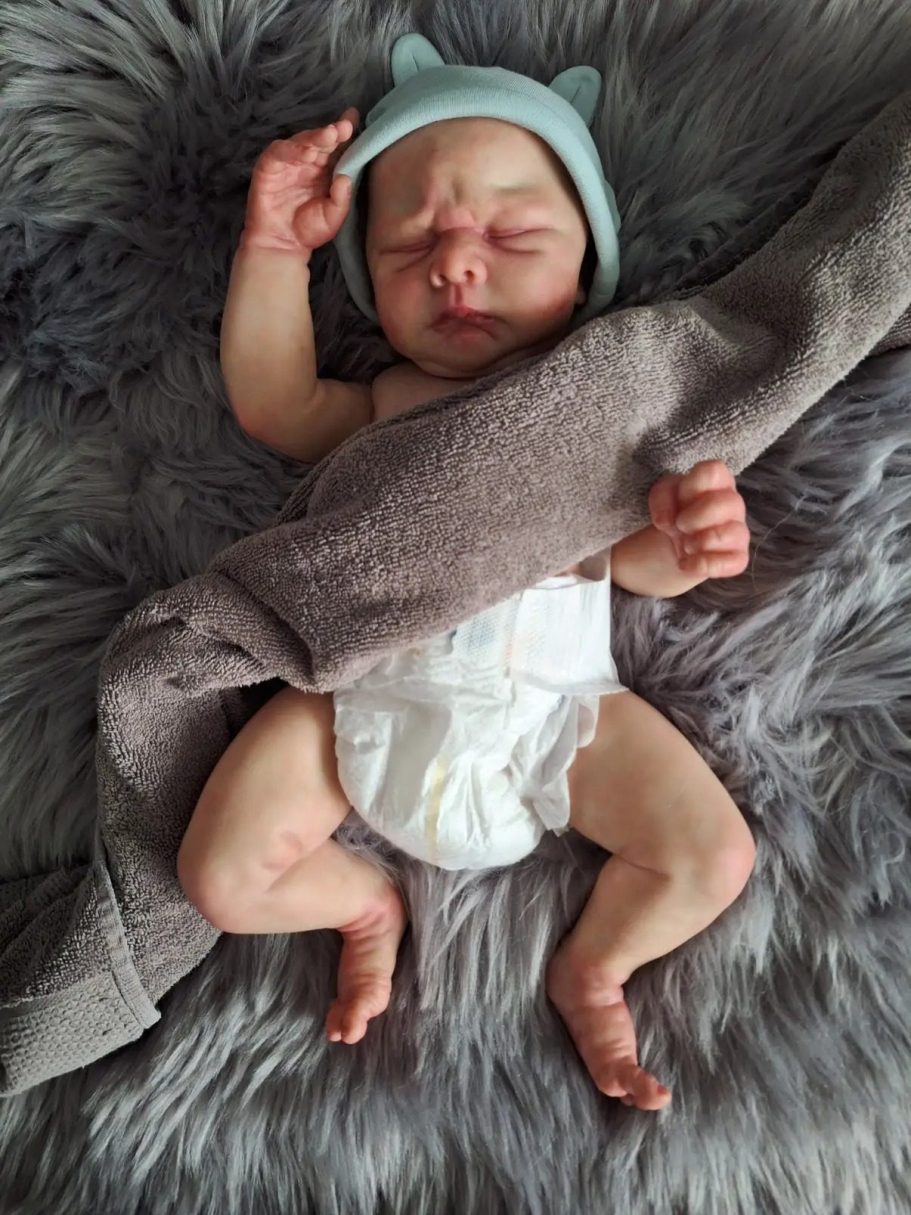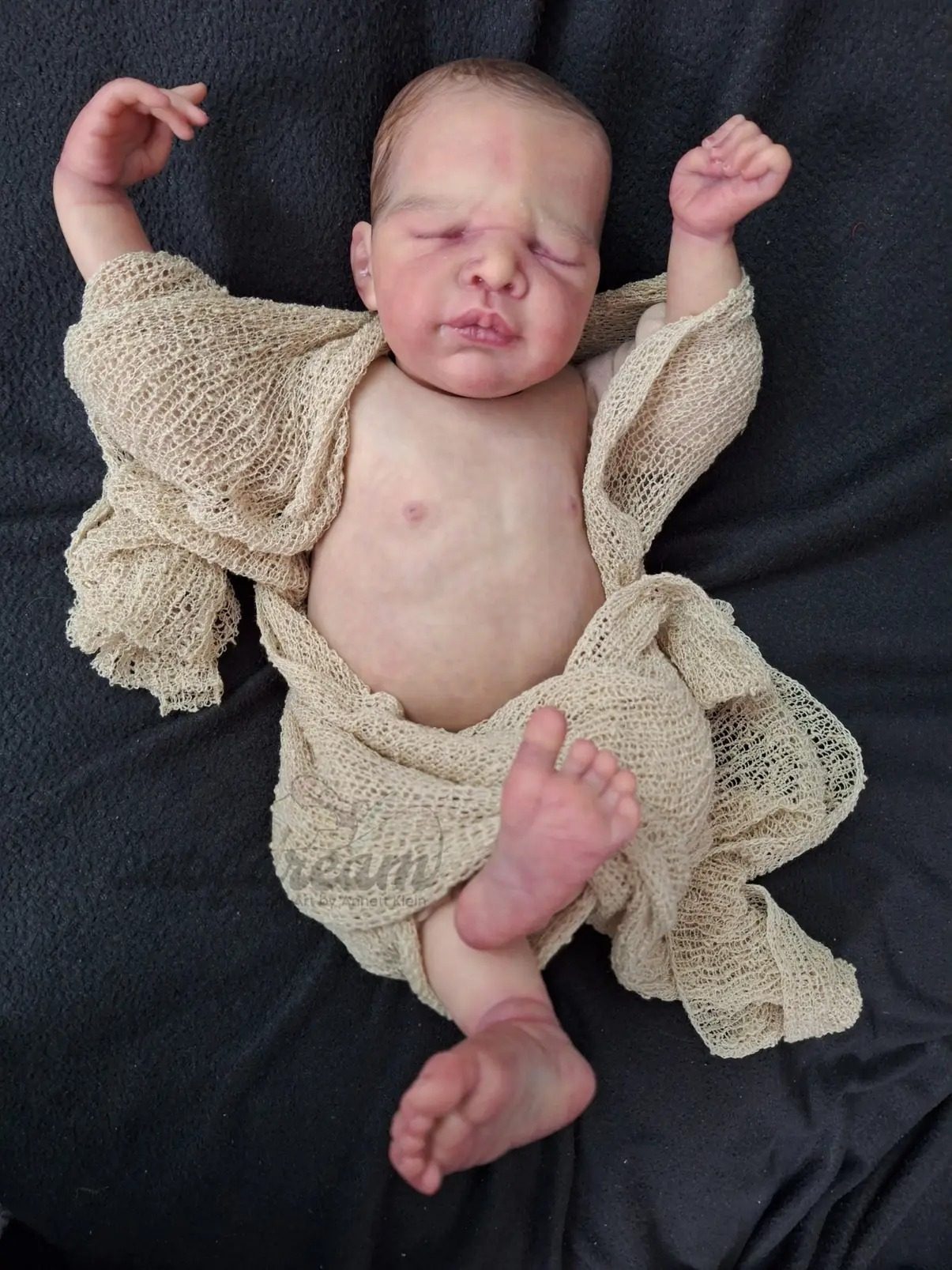 Die Haare sind in feinstem Mono-und Microrooting einzeln gestochen und aus feinem Mohair von JuNa. Die Bauchplatte für tolle Fotoshootings vollendet das Meisterwerk. Er wird mich nach Sonneberg begleiten.